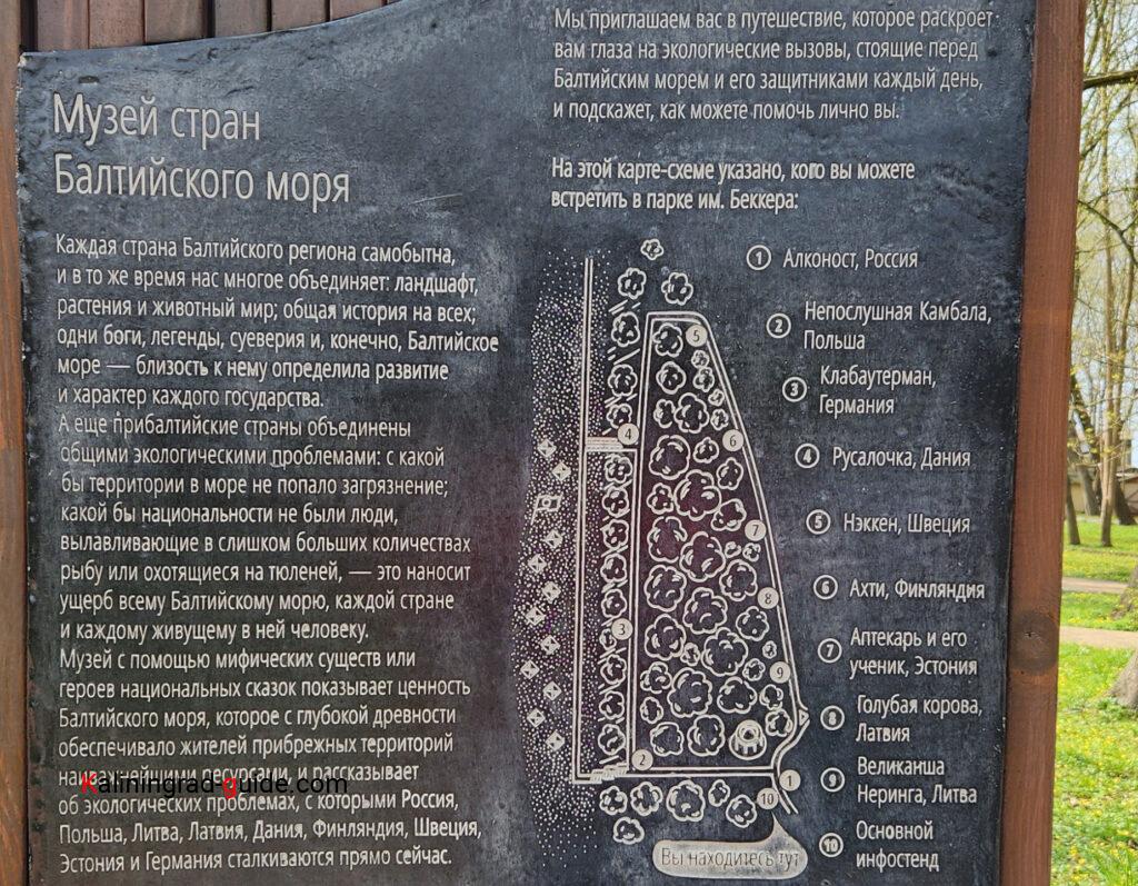 В парке находятся Музей под открытым небом стран Балтийского моря, литературно-янтарная тропа и установлены различные деревянные фигурки: гнома с котомкой янтаря, свинской семейки, кота Базилио и лисы Алисы, влюбленной парочки на скамейке, мотоцикла.