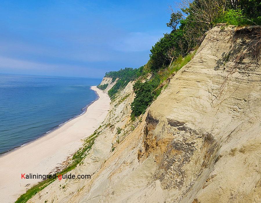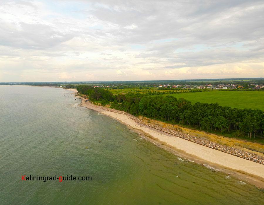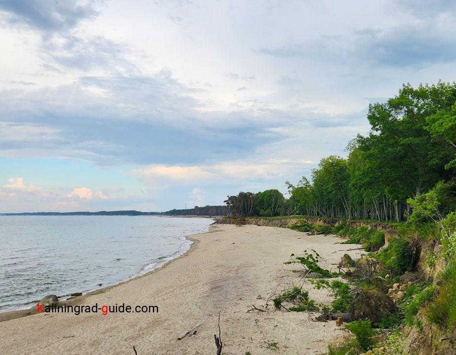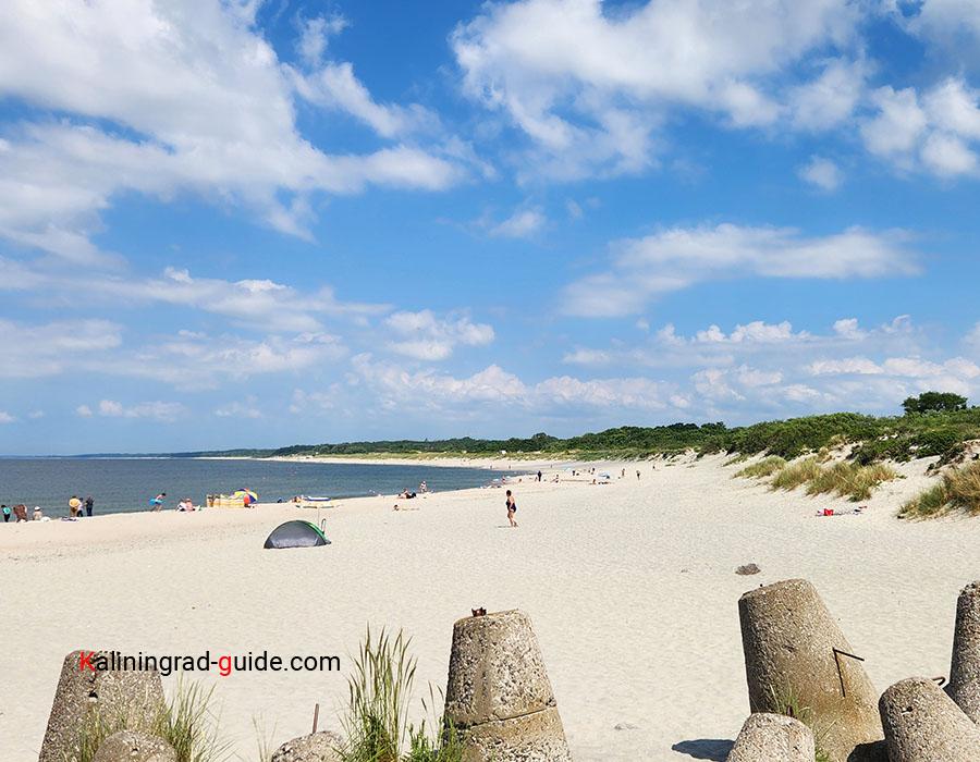 Зеленоградск находится в 32 километрах от Калининграда. Городской пляж Зеленоградска является, возможно, самым менее привлекательным местом для купания в регионе. За набережной простирается узкая полоса земли, испещренная валунами, которую иногда заливает море. Когда речь заходит о пляжах Зеленоградска, часто имеют в виду его «дикие» берега, расположенные к востоку или западу от центрального променада/города. Восточный берег, шириной до 40-50 метров, более популярен среди отдыхающих. Он окаймлен дюнами, где между песчаными холмами скрыты укромные поляны, защищенные от ветра и называемые «сковородками».